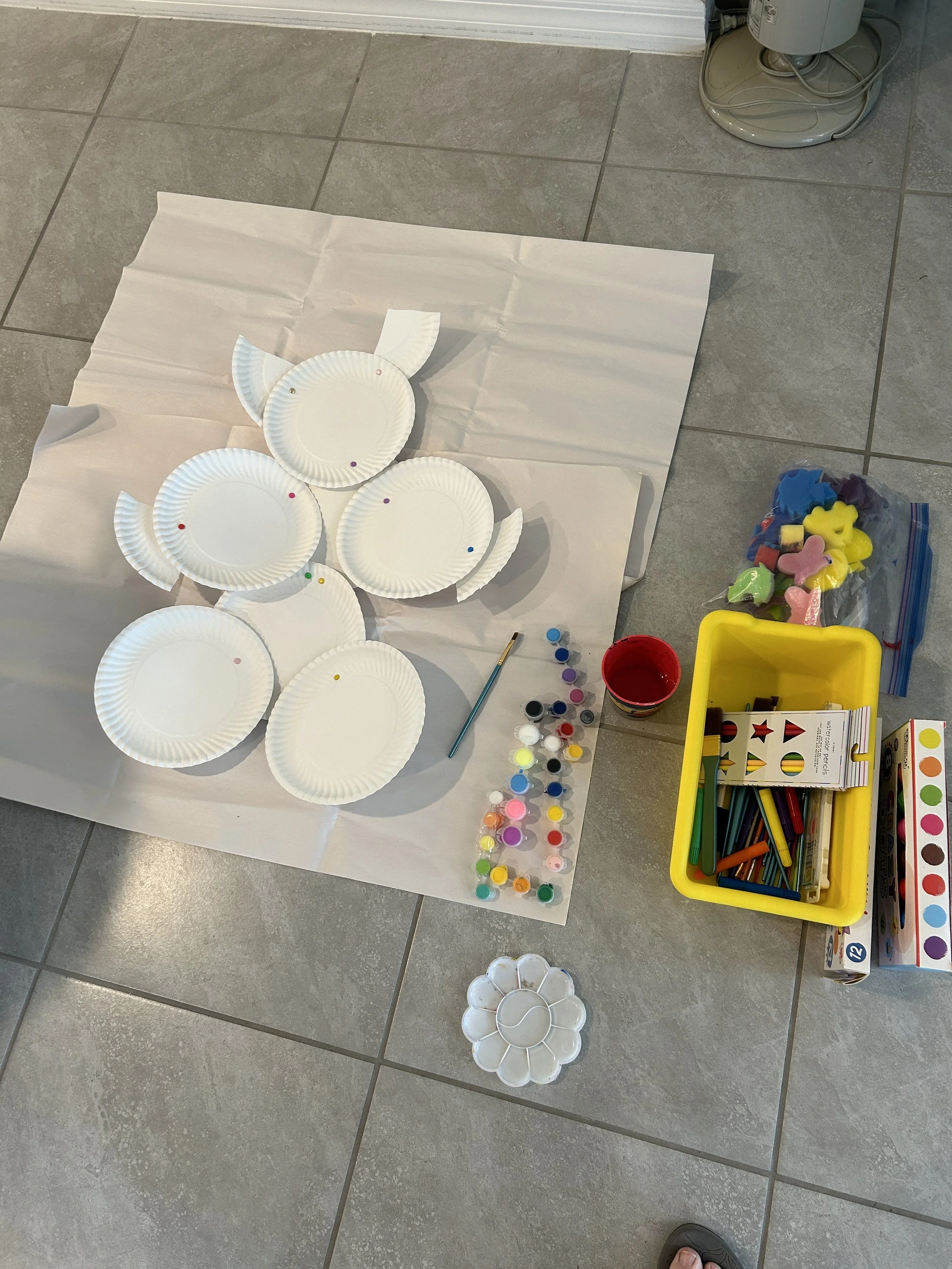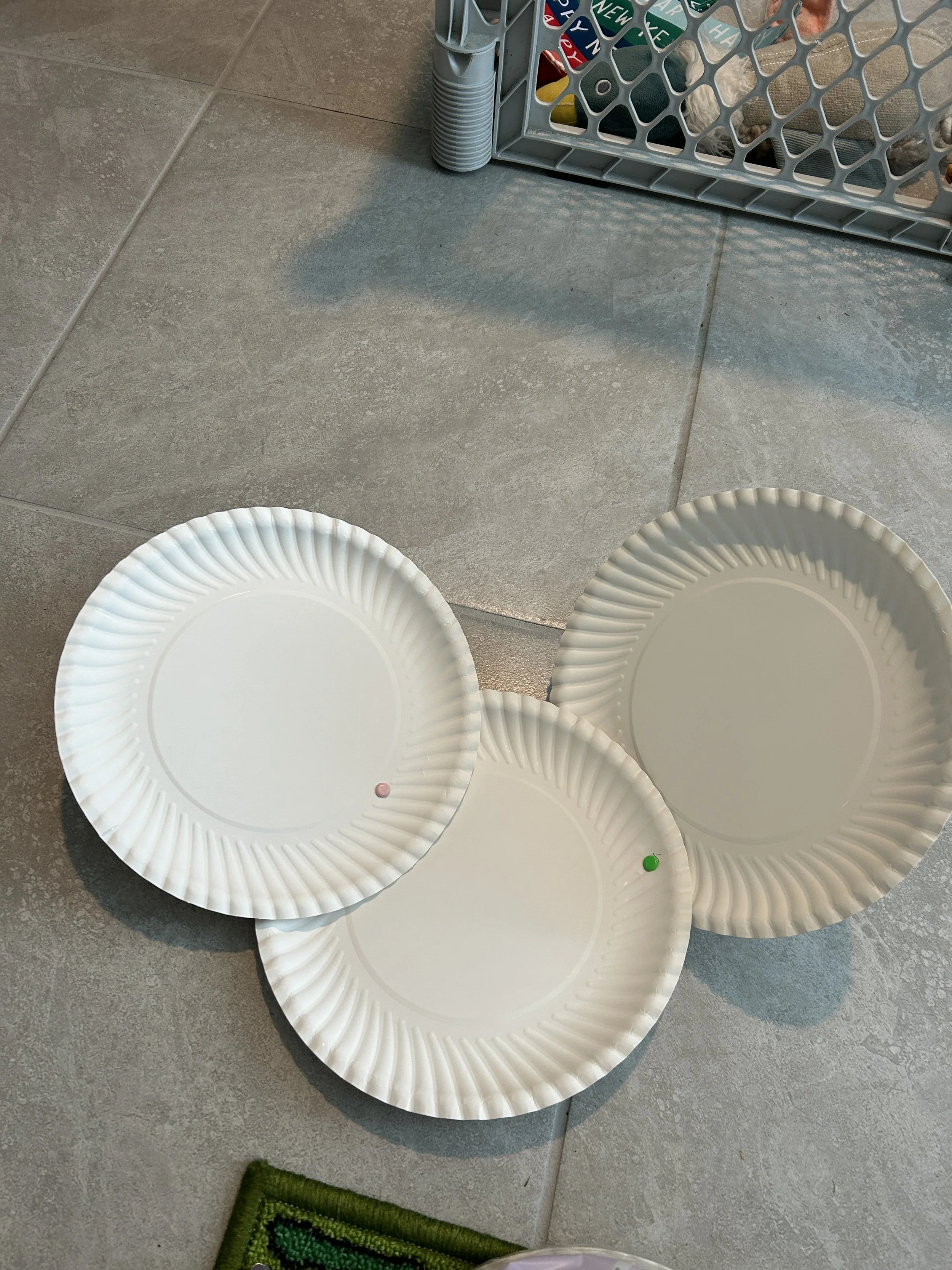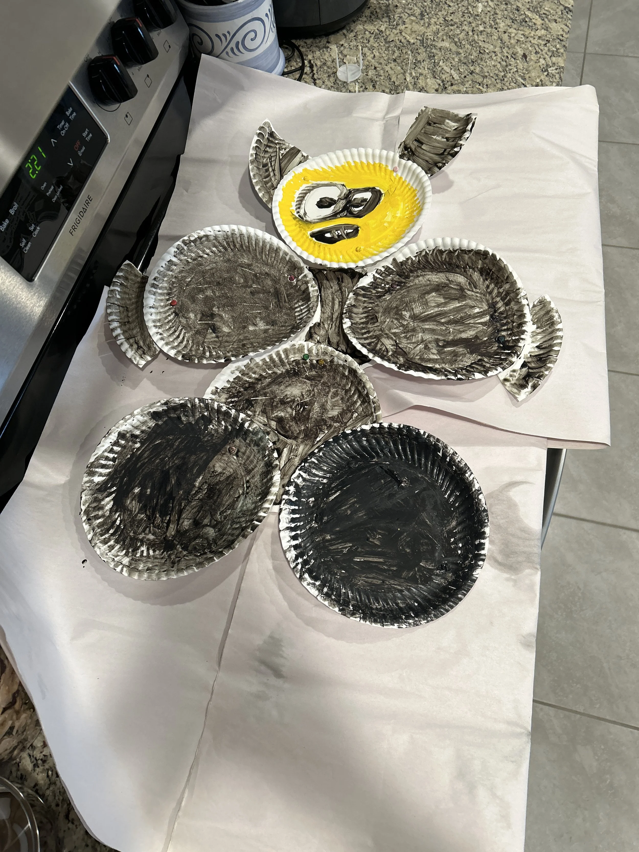 So Liam attempted a 3D Robot with our first set of paper plates. We thought it would hold up, but by morning it collapsed. lol. SO Liam convinced me to stop at Target and buy “better” paper plates for crafting. (haha) So $10 of the cheapest looking paper plates I can find we now have plenty to craft with. (oh, boy!)